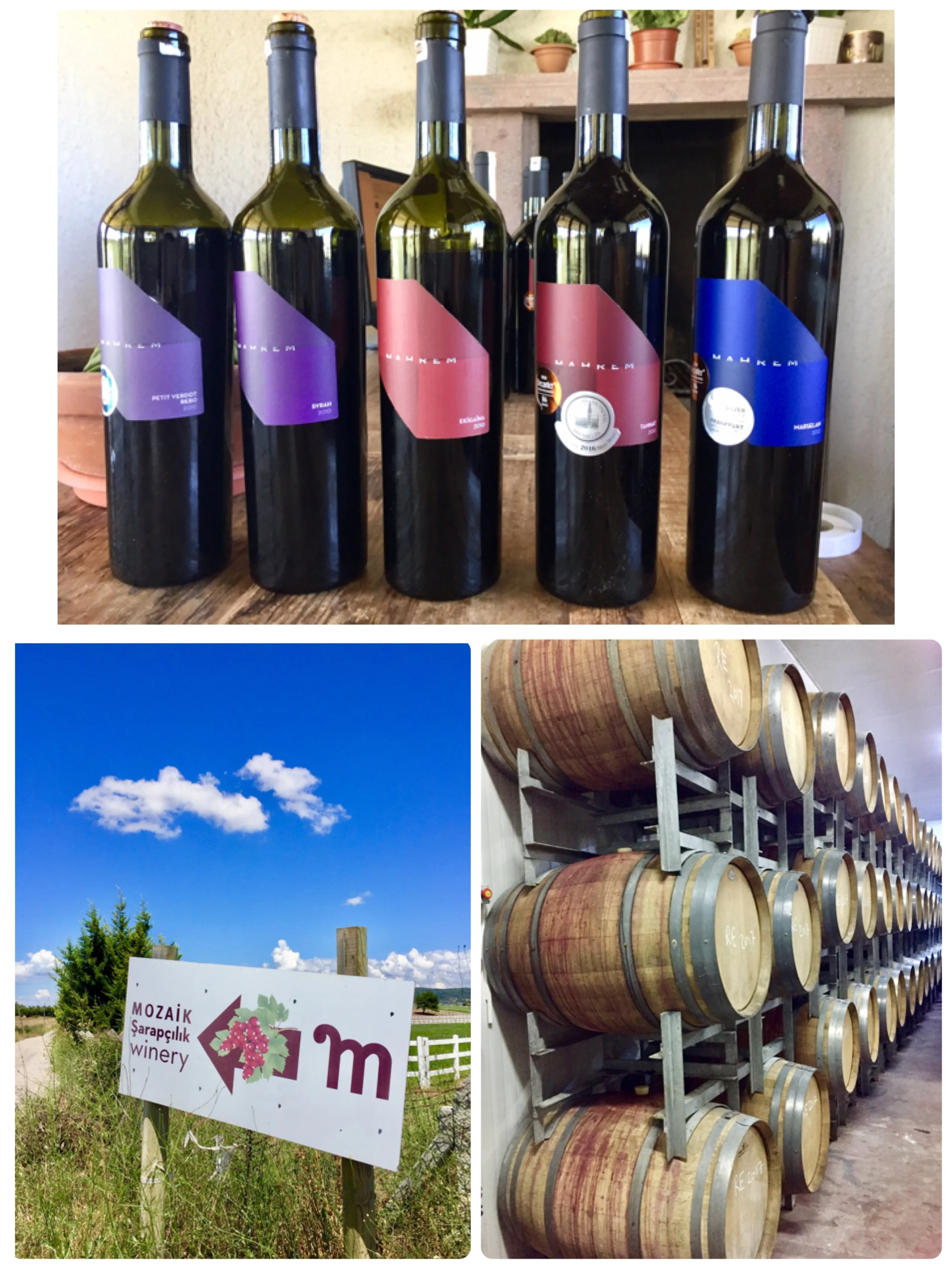 Mozaik是烏拉Urla葡萄園之路的酒莊之一,坐落在如詩般的田園天堂,葡萄園與馬場相連接,釀酒廠旁邊就是賽馬場。 樹木點綴起伏的山丘,為葡萄和馬匹提供遮蔭,而通風的馬厩正對著品酒小屋,看起寧靜祥和。 然而,葡萄園和釀酒廠的建立是充滿辛勞的。 有別於其他葡萄園,Mozaik只生產紅葡萄酒,透過義大利農藝師監督,種植九種红葡萄:Syrah,Sangiovese,Corinto,Montepulciano,Petit Verdot,Tannat,Marselan,Ekigaïna和Rebo。 這些葡萄當中,有些是新開發的葡萄品種,就算在世界葡萄酒市'場,也不容易找到。 有機地種植葡萄藤,遵循自然規律釀酒,有經驗的義大利釀酒師根據葡萄特性,小心地發酵製成葡萄酒。 2006年開始種植葡萄,並於2010年首次採收,卻在2014年發布了2010年的葡萄酒,推出的Mahrem葡萄酒系列,在國際比賽獲得多項獎項。 我們在美麗的品酒小屋內品嚐五款紅葡萄酒,酒體厚實單寧粗猛強勁,酒精濃度偏高,屬於可酒窖陳放的酒款。 看到堆積的橡木桶在酒窖內,佩服莊主有勇氣選擇與眾不同的葡萄品種,小農釀酒精神可嘉!