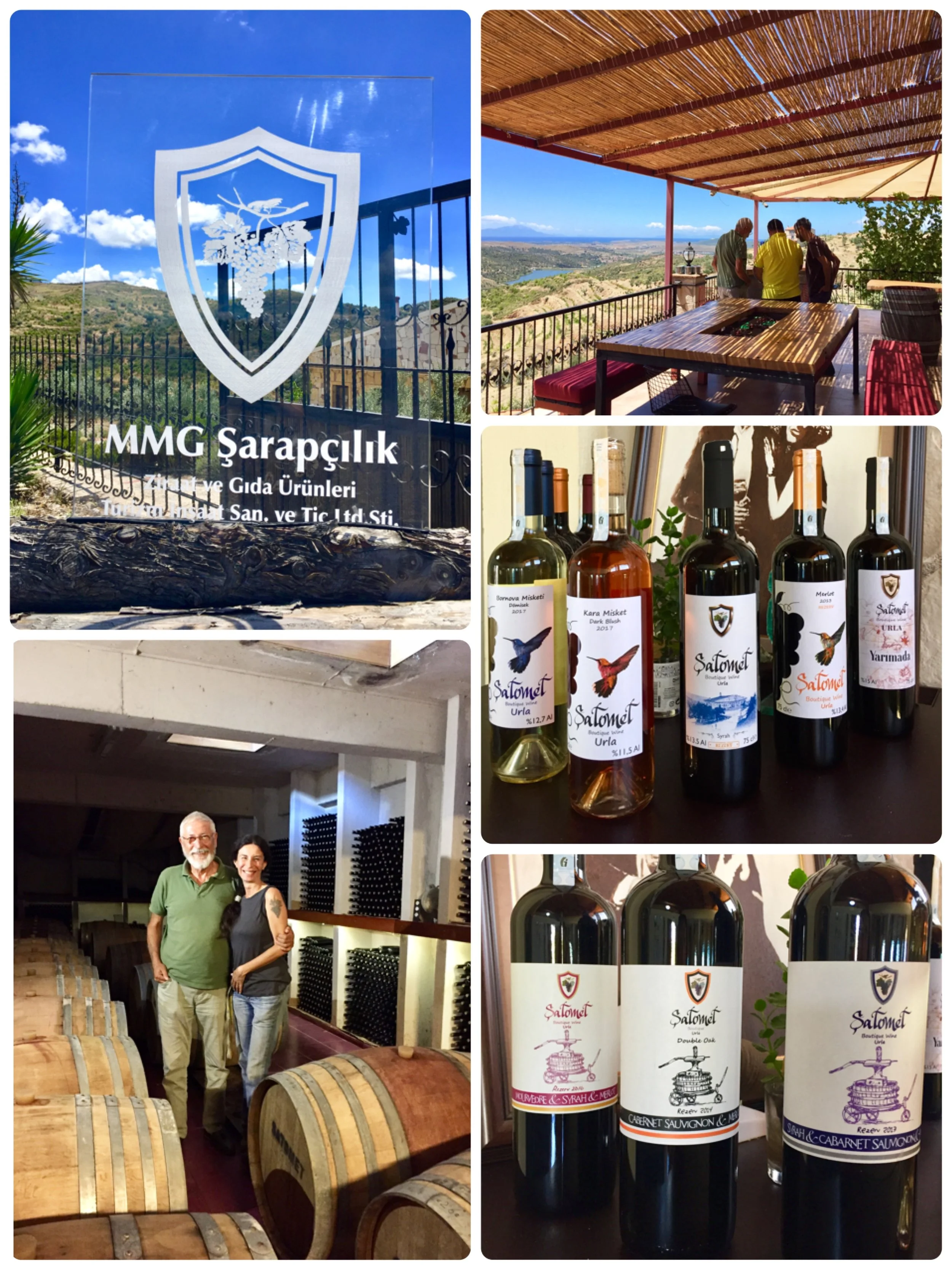 MMG酒廠是家族企業,用傳統方式釀酒,葡萄在夜間採收,透過重力進行手工按壓,每年生25,000瓶葡萄酒。 爸爸Metin是神經外科醫師,同時也是大學教授博士,退休之後,跟兒子Mert、女兒Meltem一起經營葡萄園,取名MMG是大家名子第一個字母是M的關係。 2007年開始種植葡萄,對稀有葡萄品種Bornova Misketi, Foçakarası栽培很用心,2012年推出Şatomet系列葡萄酒。 MMG 酒莊設有Şato Inn餐廳,俯瞰山谷全景,可容納60位客人用餐。 我們品嚐所有系列葡萄酒,相信Şatomet酒款仍有進步空間,畢竟小農手工生產不容易。 MMG待客熱忱讓人賓至如歸,到烏拉Urla葡萄酒之路肯定要繞過去,聽聽他們釀酒的甘苦談,同時賞美景美酒,一舉二得。