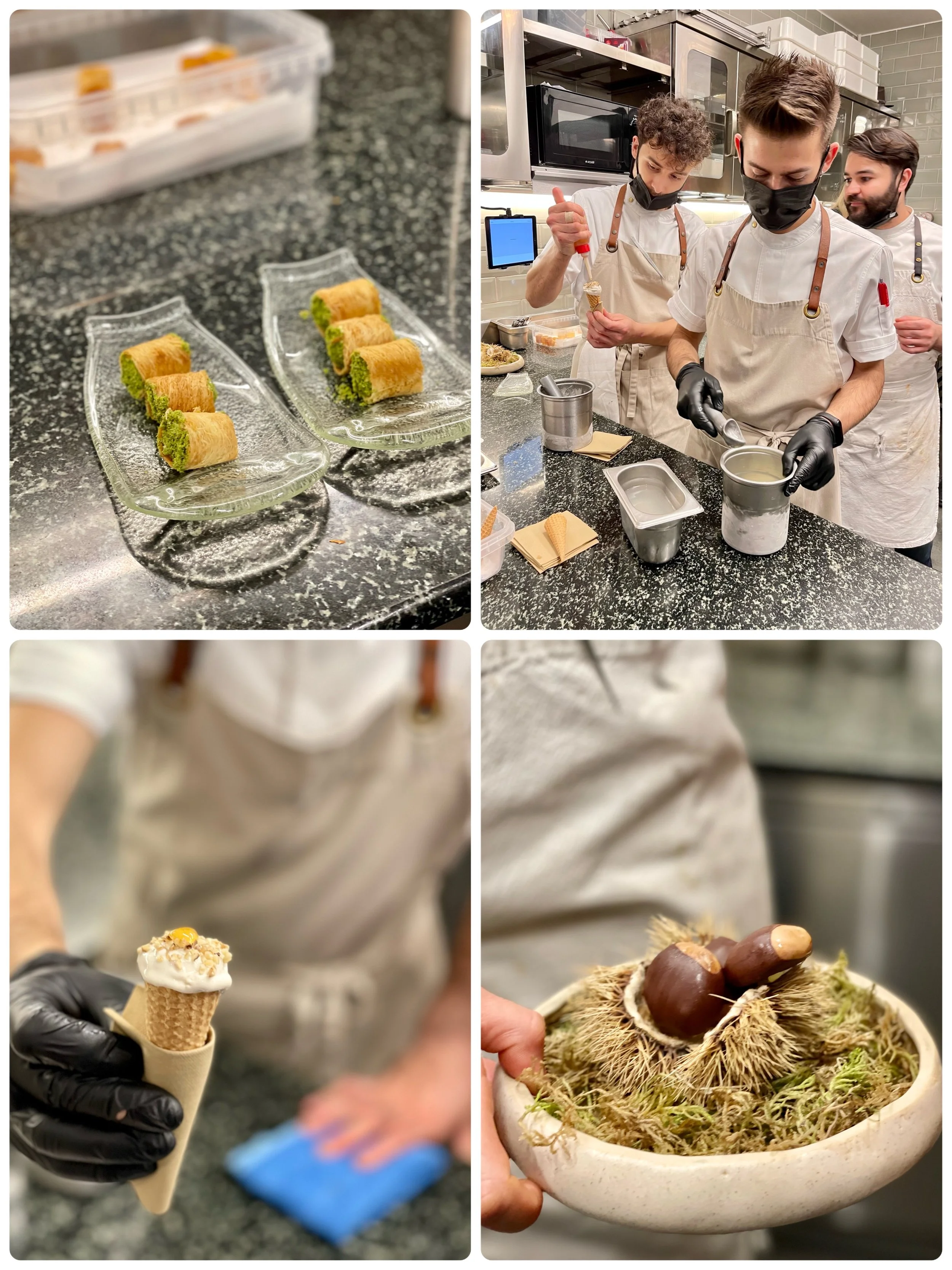 說實話,我沒吃過這樣的土耳其菜,不光食材來自全國各地,菜的味道與形狀全被解構,精緻到宛如藝術品,不忍吞下去。 帥主廚Fatih總是站在開放廚房櫃台內右邊,鷹眼般掌控廚房與現場,我找到機會跟他聊幾句,原來他曾經在台北東方文華飯店內餐廳工作,幾年台灣經驗讓他喜歡牛肉麵,幫他拍照他還吐舌頭手比V,很台呵! 上甜點時餐廳邀請食客參觀廚房,清潔且設備齊全的環境讓人印象深刻,年輕帥氣的甜點廚師手工製作各種小甜食,讓食客們驚喜連連。