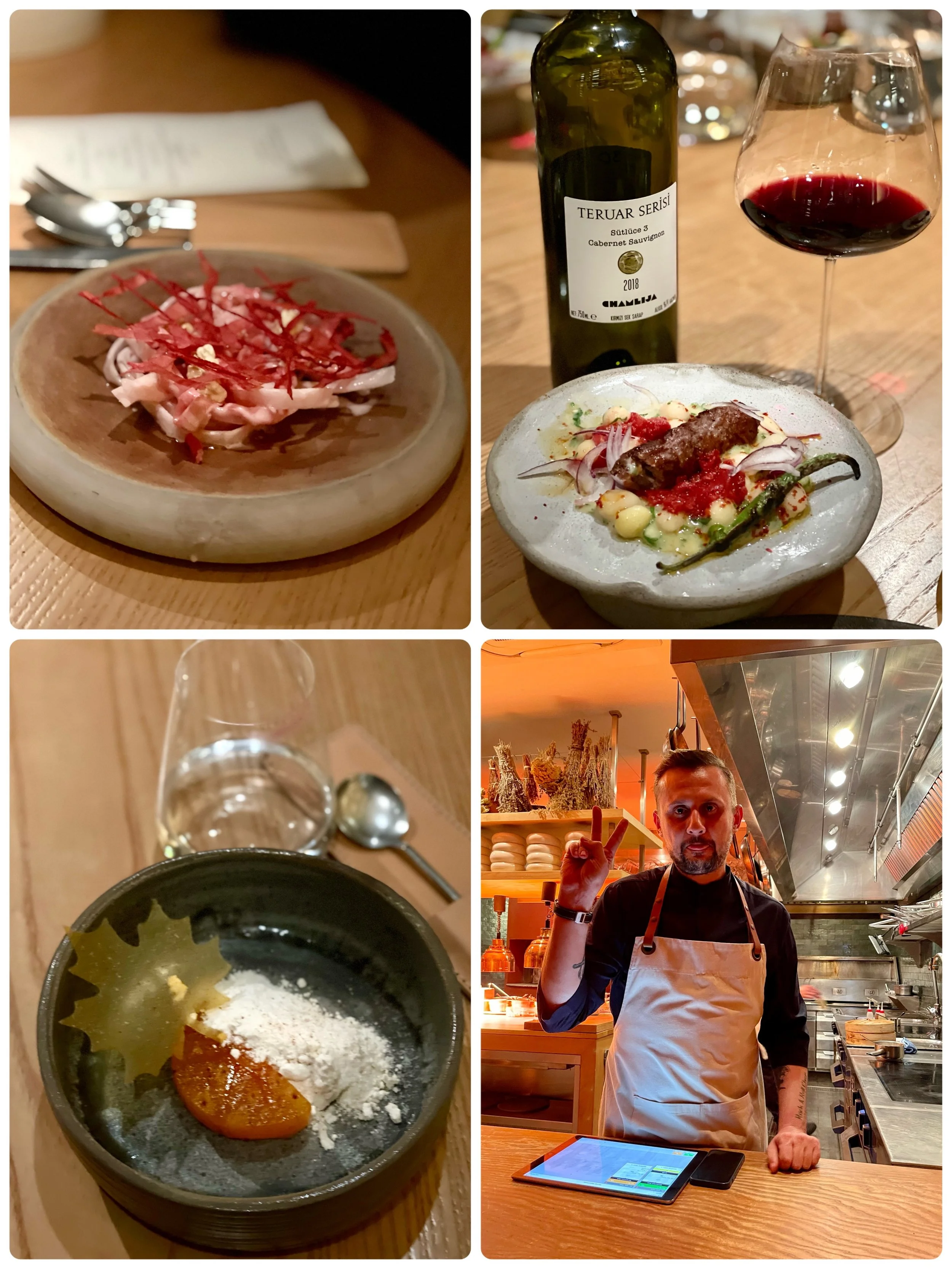 朋友的鄰居是Fatih Tutak的朋友,年初時,朋友說這家餐廳值得前去,我上網查看,感覺餐廳精緻有風格,但不滿意土耳其葡萄酒單,其實也沒很差,就是自己太龜毛罷了,於是去電要求自帶葡萄酒,沒想到餐廳拒絕我,而且問餐費是否已經匯出,不然視為沒有完成訂位。 有點驚訝,我知道很多土耳其人喜歡放鴿子,但也不至於預付餐費,後來我們匯出餐費,也同意每瓶46美金的開瓶費,於是快樂地帶3瓶葡萄酒前去。 餐廳可容納50個座位,只有一個套餐餐單但份量足,包括9道餐和2道甜點,分別是: Turşu Suyu, Tereyağ Bal, Midye Dolma, Mantarlı Yumurta, Palamut, Patates Soğan, Izgara Çupra, Kıvırcık Kuzu, Cennet Hurması,菜單隔段時間會更新。