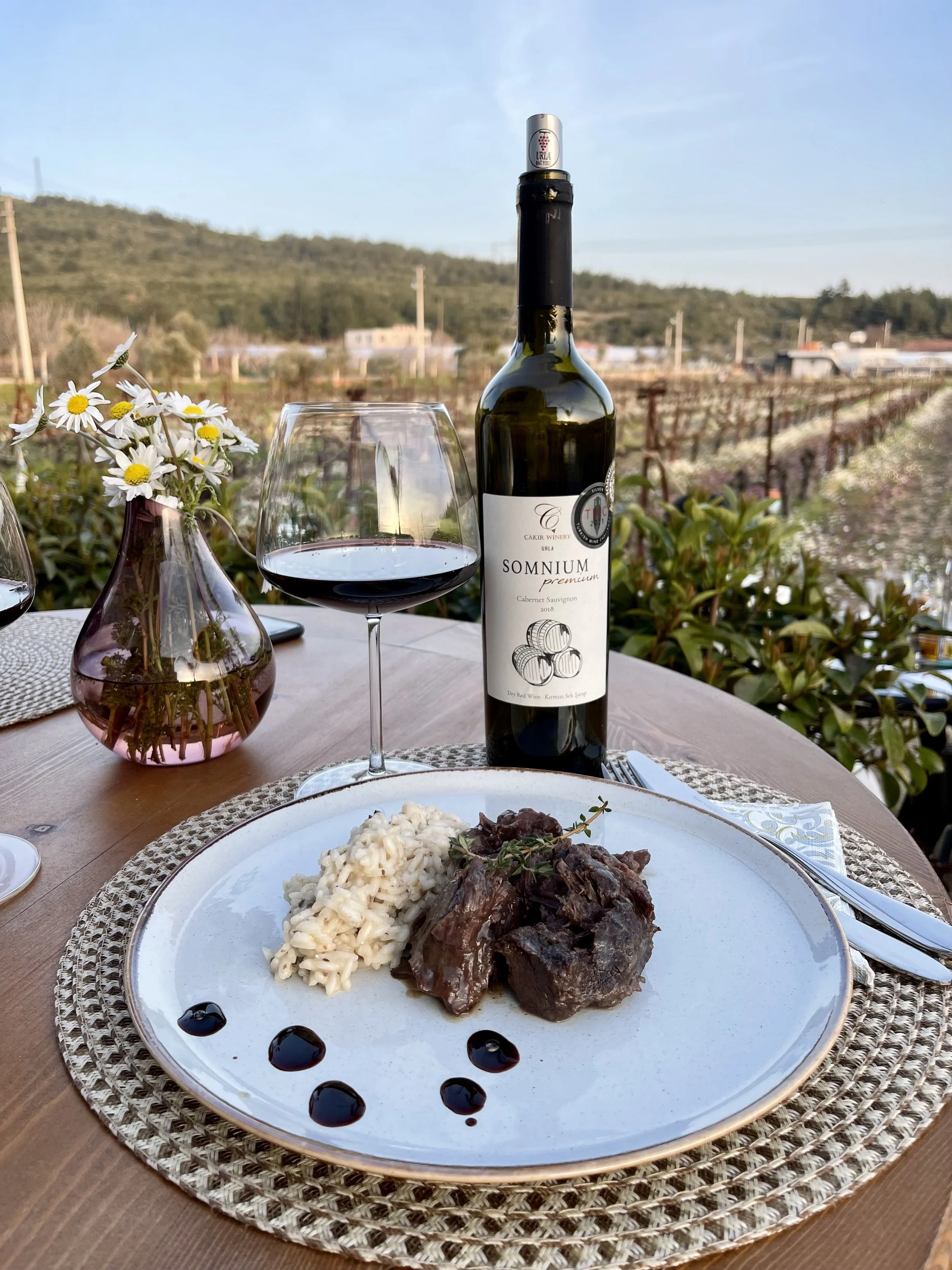 酒莊餐廳布置有風格,訪客特別喜愛室外用餐,看著葡萄園曬著太陽好愜意,最受歡迎的是起士盤搭配葡萄酒,餓了就來盤烤比薩填肚很實際,而我們享用慢烤牛頰肉佐義式燉飯,廚師的水準不錯,如果跟葡萄酒PK的話,感覺餐廳勝出。 這是土耳其小農釀酒的現象,很多年產量少的小農附設飯店或是餐廳,精緻且具吸引力,很多訪客不僅就地消費,且隨手購買許多葡萄酒回家,送人或是自飲都好,厲害的小農甚至年產量80%這樣賣掉,相對的,沒有經過酒市場嚴厲考驗,酒品質就無法提升,反正容易賣掉大半葡萄酒。 到了Urla半島旅遊,想找個好地方用餐,只要環境佳、餐可口、葡萄酒還行的話,就去Çakır酒莊瀟灑走一回吧!