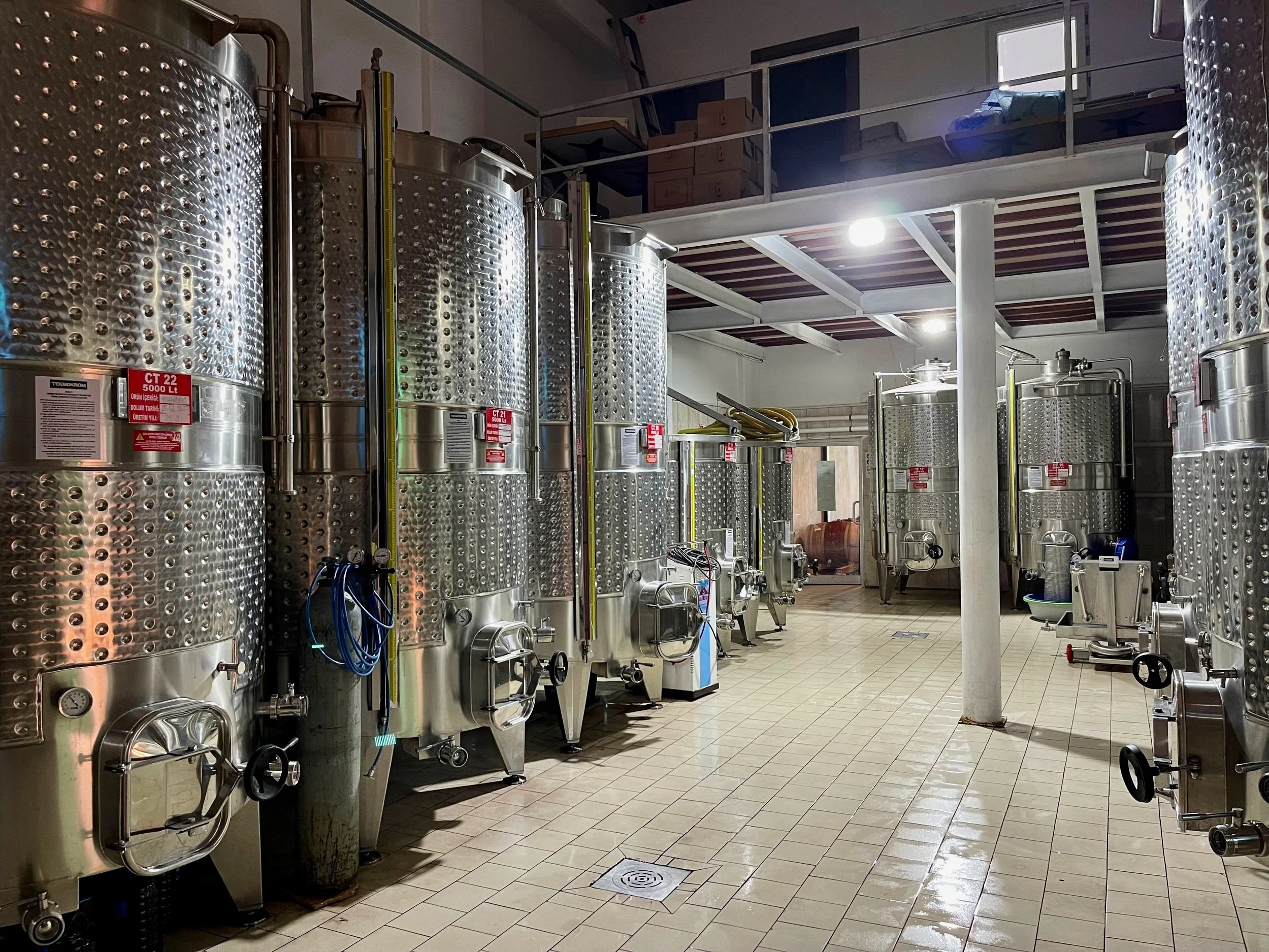 Akın每年擴展酒廠,他從8千瓶成長到5萬瓶,許多設備不斷新增,每次去拜訪總是發現新改改變。 這次發現酒窖有更好安排,他不用爬來爬去取酒給我們品嘗,更多大新鋼桶和釀酒器具。 其實他該做葡萄酒分級,把最優橡木桶的葡萄酒做特級酒款,調高價格增加獲利,他總擔心消費者抱怨太貴,低價快速銷售為要。 這次Akin準備10款樣酒給我們品嘗,品飲筆記如下: