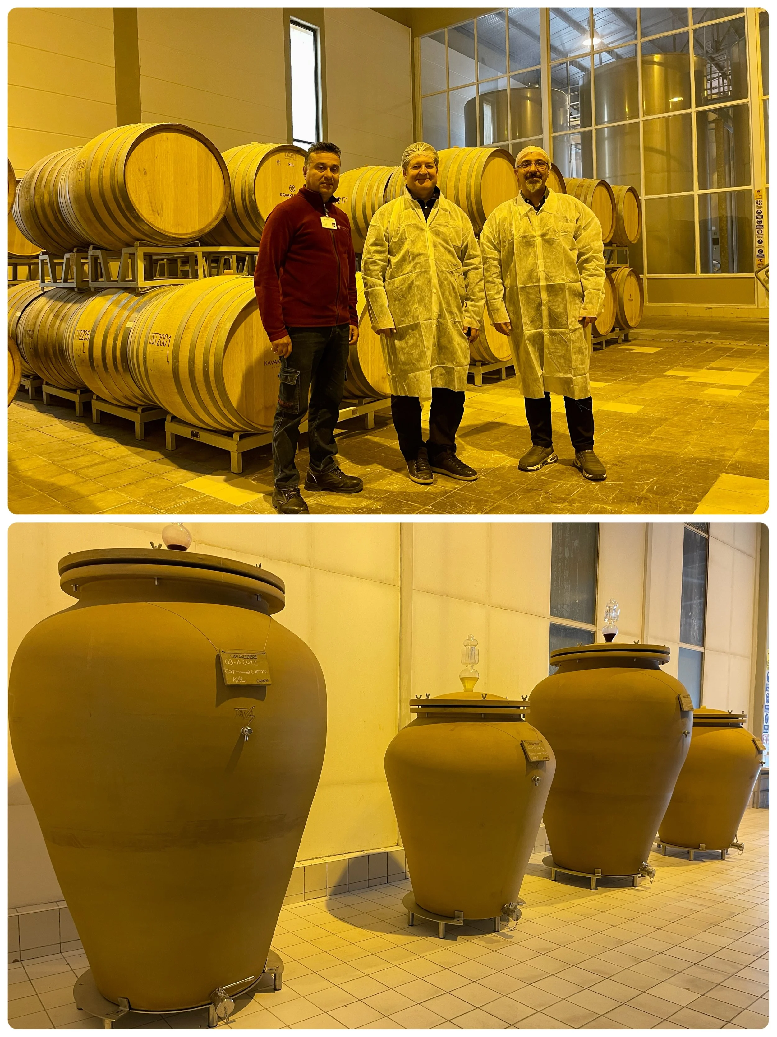 酒廠設備占地面積大,不管是酒槽鋼桶區、橡木桶酒窖、作業包裝區,占地大且規劃完善。 參觀過無數土耳其酒廠,Côtes d'Avanos是第一家要我們穿白袍、髮罩和鞋套的酒莊,衛生控管很嚴謹。 接著參觀葡萄園,接待我們的經理介紹解釋好詳細,葡萄園海拔高度在900-1070米之間,一般呈南北方向排列,然而,自2012年以來,為了防止陽光灼傷葡萄串,開始在東西方向種植新的葡萄品種,特別是白葡萄品種。 以大陸性氣候為主,夏季炎熱乾燥,冬季寒冷多雪,但這幾年冬天溫度達零下20度,幾乎可以凍死葡萄藤,必須預先做埋土法,或是做其他防凍措施,葡萄園管理不容易。 Côtes d'Avanos葡萄園的土壤結構具有火山特徵,呈弱鹼性、無鹽分、鈣質,有機質和養分含量較弱,持水能力較低,鈣質結構和有機質含量低,對產量造成影響。 沙質般的土壤,很容易附著於葡萄葉,為了不影響光合作用,必須定期對葡萄葉噴灑水。 葡萄產量因葡萄品種而異,Kavaklidere Côtes d'Avanos葡萄園平均葡萄產量為2500-5000公斤/公頃,這產量算是少的,土壤和氣候的緣故,葡萄得水滋潤不易,難怪葡萄濃縮滋味好,才能釀出酒體佳且多層次的優質葡萄酒。