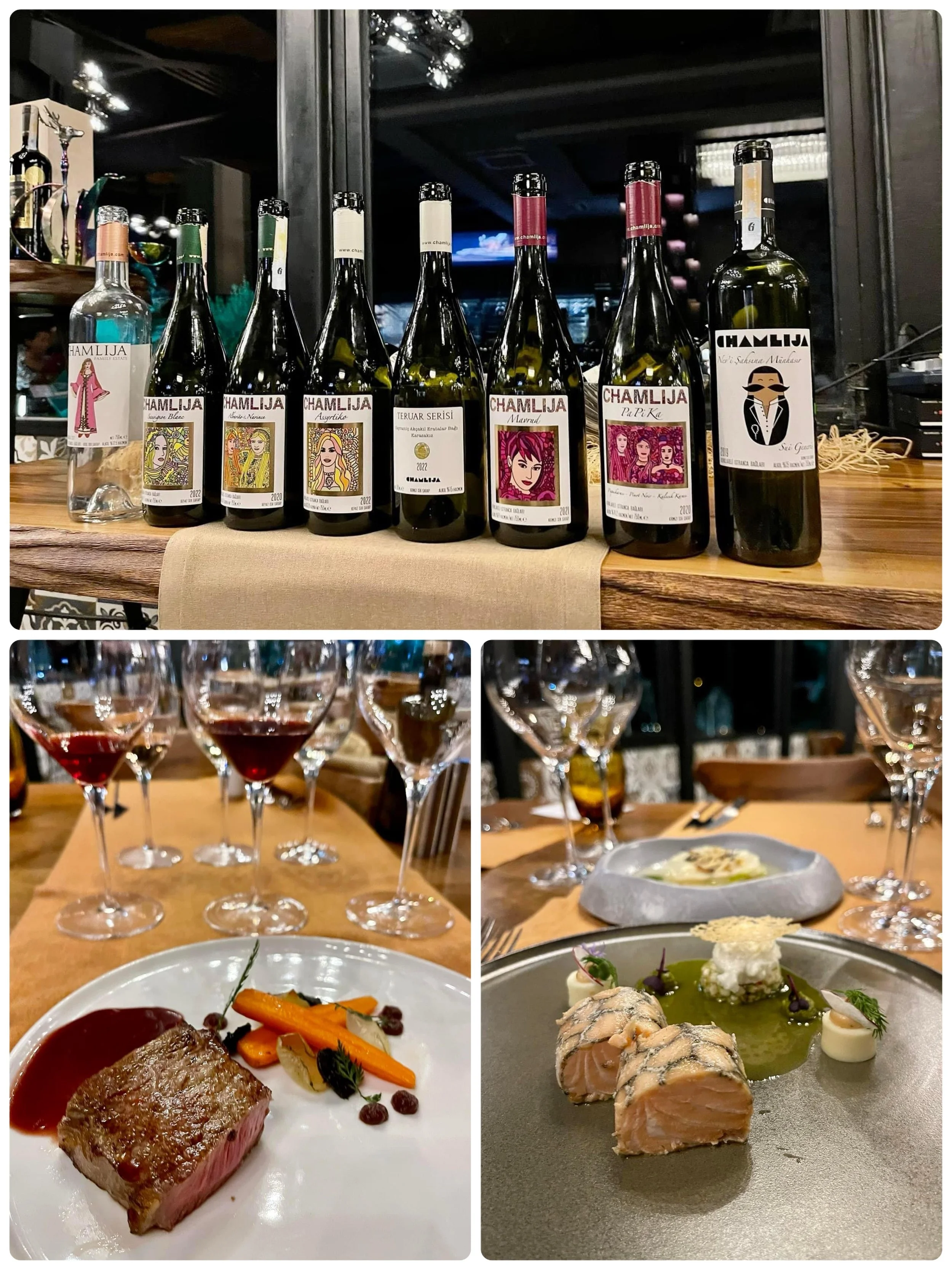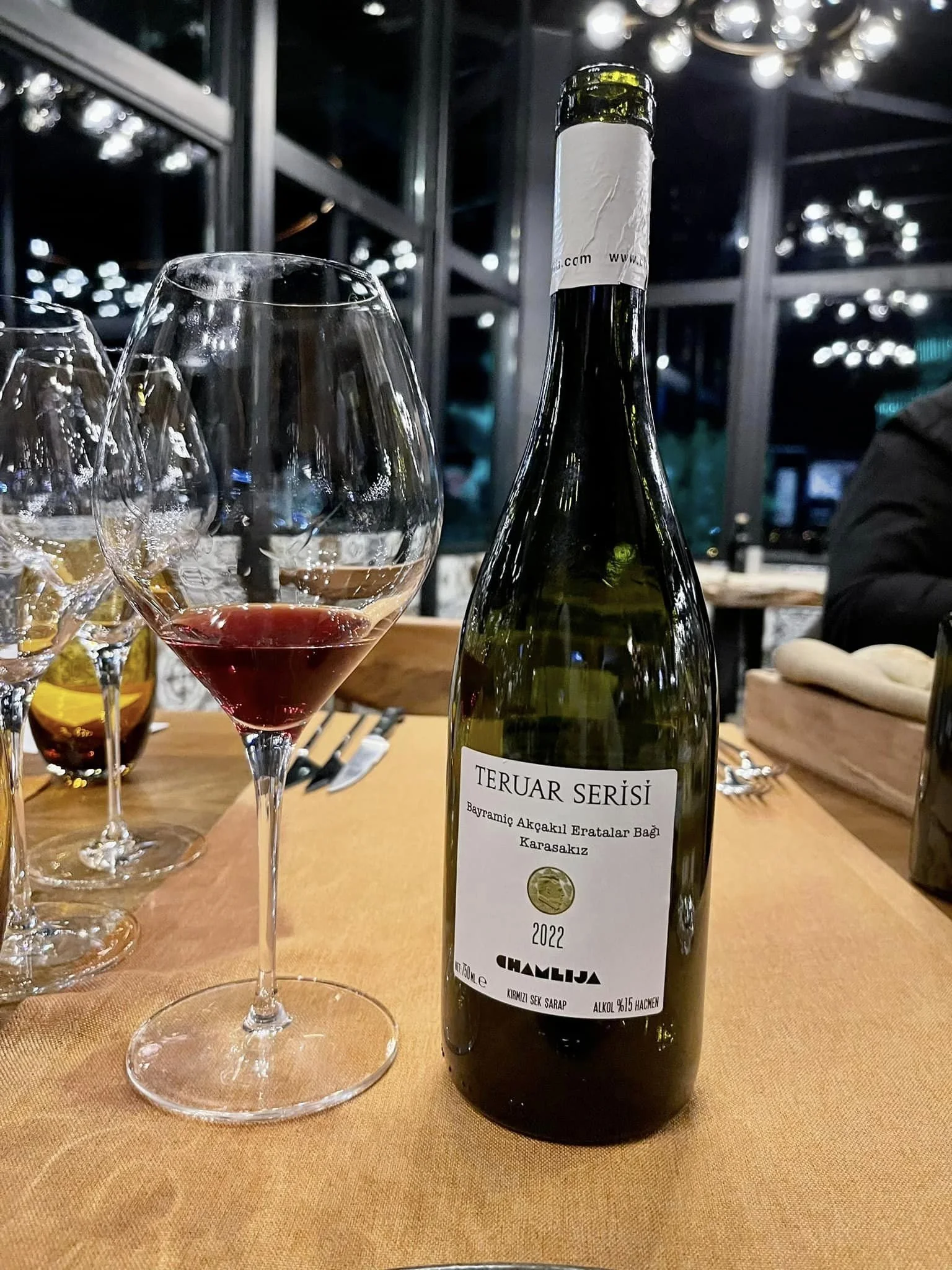 Chamlija酒莊老闆幫好友女兒釀酒,用Karasakız老藤葡萄生產,實驗性地釀製400瓶。 這有故事的,年輕人決定放棄城市生活與工作,跟男朋友到Kaz山區生活,方圓數十里無人煙,沒有自來水與供電,二人住露營車過著原始生活。 駐紮地周圍全是Karasakız老藤葡萄,於是老爸拜託莊主好友幫忙釀酒,讓年輕人的放逐生活有目標,真是天下父母心啊! 我們來到愛琴海Kaz Dağı山區,這裡是全國空氣含氧量最高的地方,盛產葡萄、水蜜桃、櫻桃、橄欖。 海風吹到山區帶來水氣,日夜溫差良好,Karasakız原生葡萄起源附近,葡萄的酸度和質地適合生產白蘭地烈酒,40多年前有白蘭地工廠從事生產,後來工廠關閉,但葡萄樹還在,都是難得的老藤葡萄。 這裡人煙稀少有如秘境,天然純淨的環境,走逛葡萄園好舒心,相信這些葡萄能釀出有機好酒。 Chamlija Karasakız 2022葡萄酒推出時,在Çanakkale的Avek飯店舉辦餐會,介紹新酒上市,勇於嘗鮮的我們冒著大雪前去。 遠在Çanakkale的飯店餐廳作出厲害套餐,附近Ezine起士全國聞名,餐裡面有許多起士入菜,對中國胃的我來說還行。 莊主提供多樣且充沛的葡萄酒,這頓飯有9款Chamlija葡萄酒搭配,餐酒搭配相得益彰,我們品嘗新酒款,同時認識新朋友,收穫滿滿!