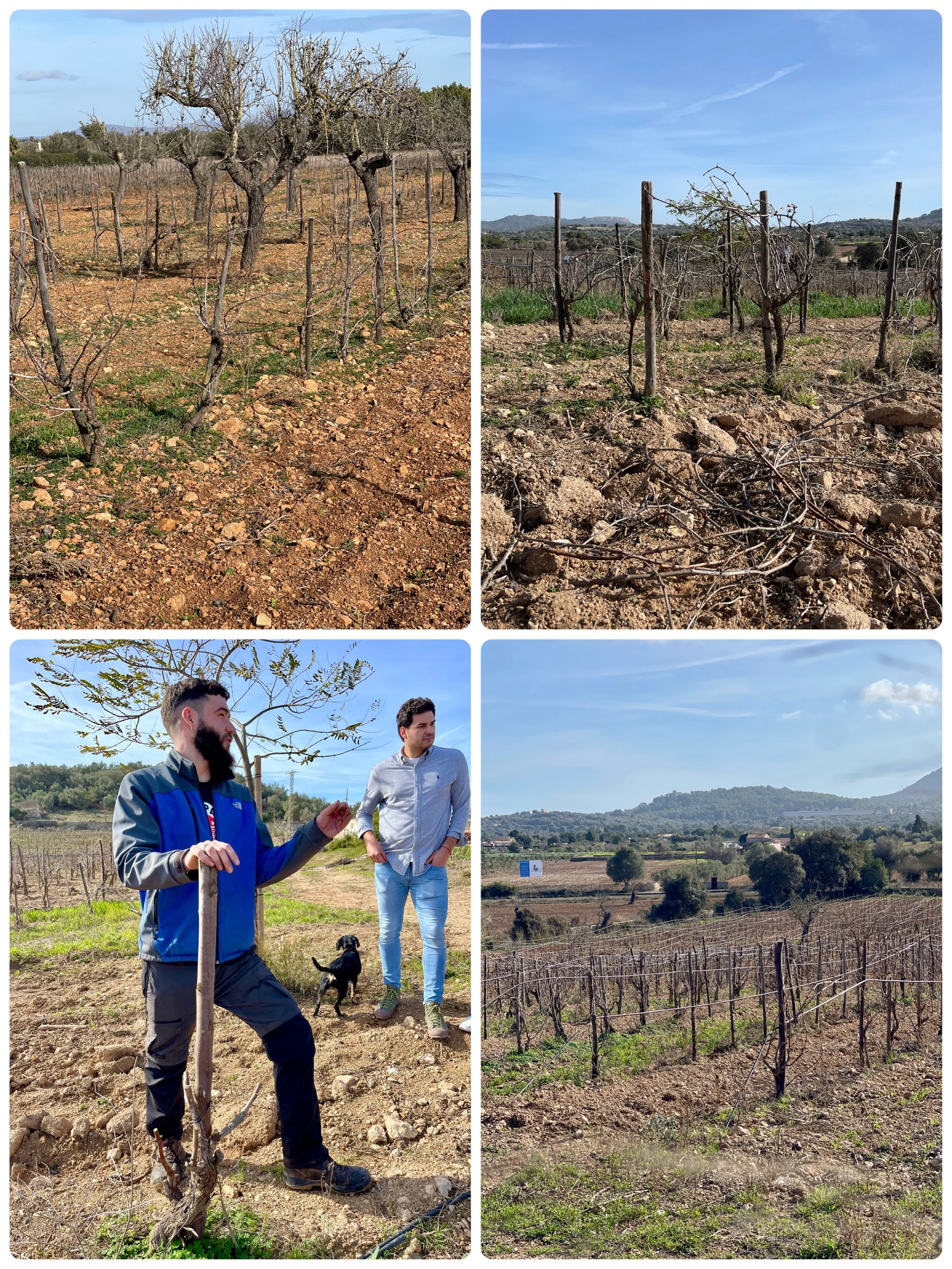 難見的一月好天氣,負責接待的Toni領著大家逛葡萄園,酒莊周圍的葡萄園種著各種葡萄,這裡的土質有紅色鐵質粘土、礫石砂和粘土石灰岩,種植的葡萄品種包括當地葡萄Callet、Manto Negro、Monastrell和Fogoneu,以及國際葡萄品種希拉、卡本內和梅洛,Toni說,將會逐漸轉向更多當地原生品種葡萄釀製的趨勢。 Callet葡萄特別適合當地風土,4 Kilos酒莊採用生長於紅色鐵質黏土的Callet老藤葡萄,釀製酒莊的旗艦葡萄酒,這便是忠於本土品種的承諾。 這裡的風土非常不容易,降雨量少讓乾旱問題浮出,隨著地球暖化,有些年份乾旱到影響收成,Toni說葡萄園周圍必須種杏仁樹,當葡萄收成短缺時可以賣杏仁來貼補收入,靠天吃飯真不容易。 當地土壤Call Vermell呈紅色富含氧化鐵,是礫石與粘土結合,對葡萄樹來說是完美的,因為粘土在更深層中能保留水分,而礫石可以防止儲備水分蒸發,有利於當地典型地中海氣候,舒緩夏季嚴重乾旱問題。 在合理和環保狀態下,使用自然動力法和有機法栽種葡萄。