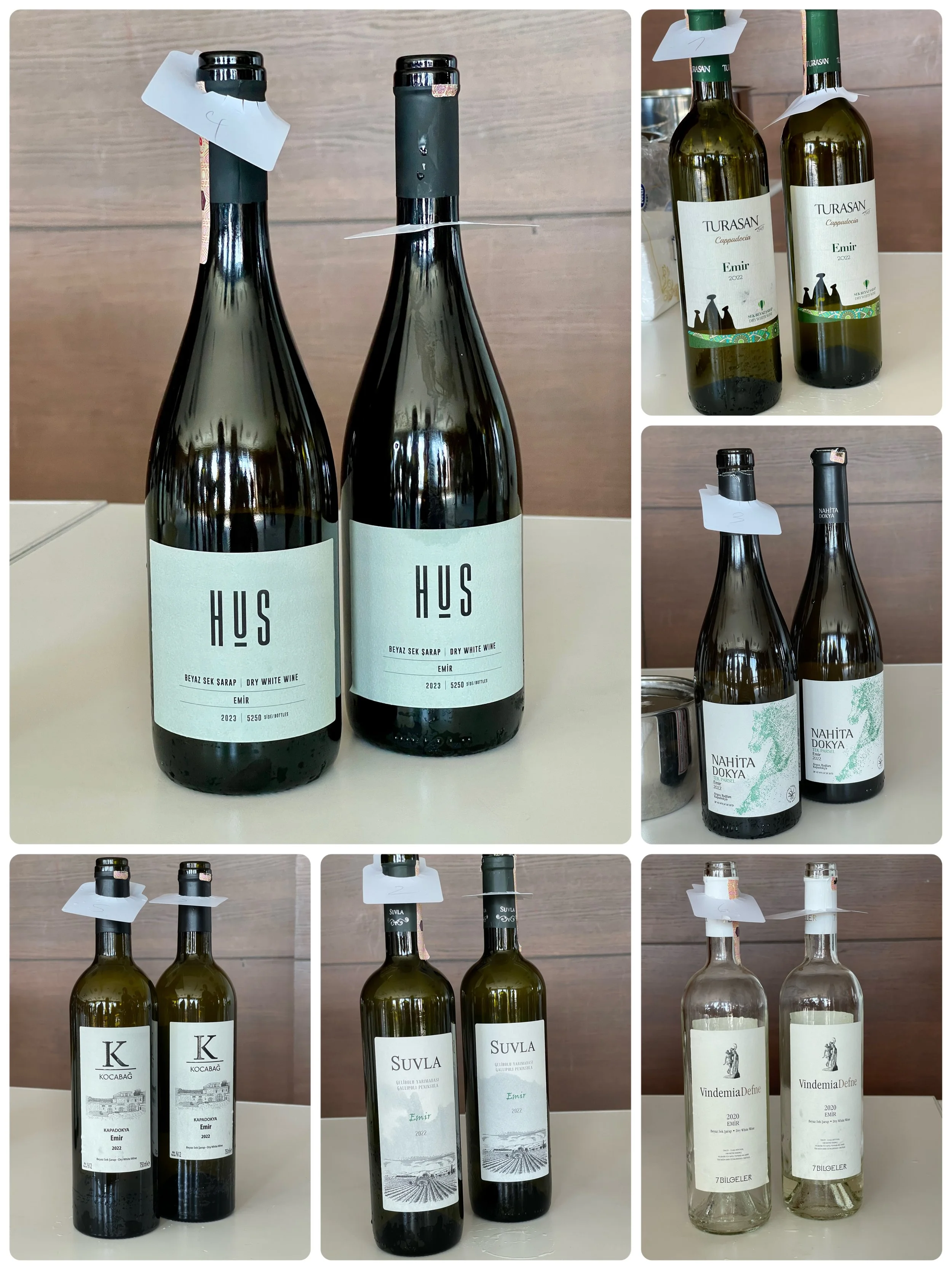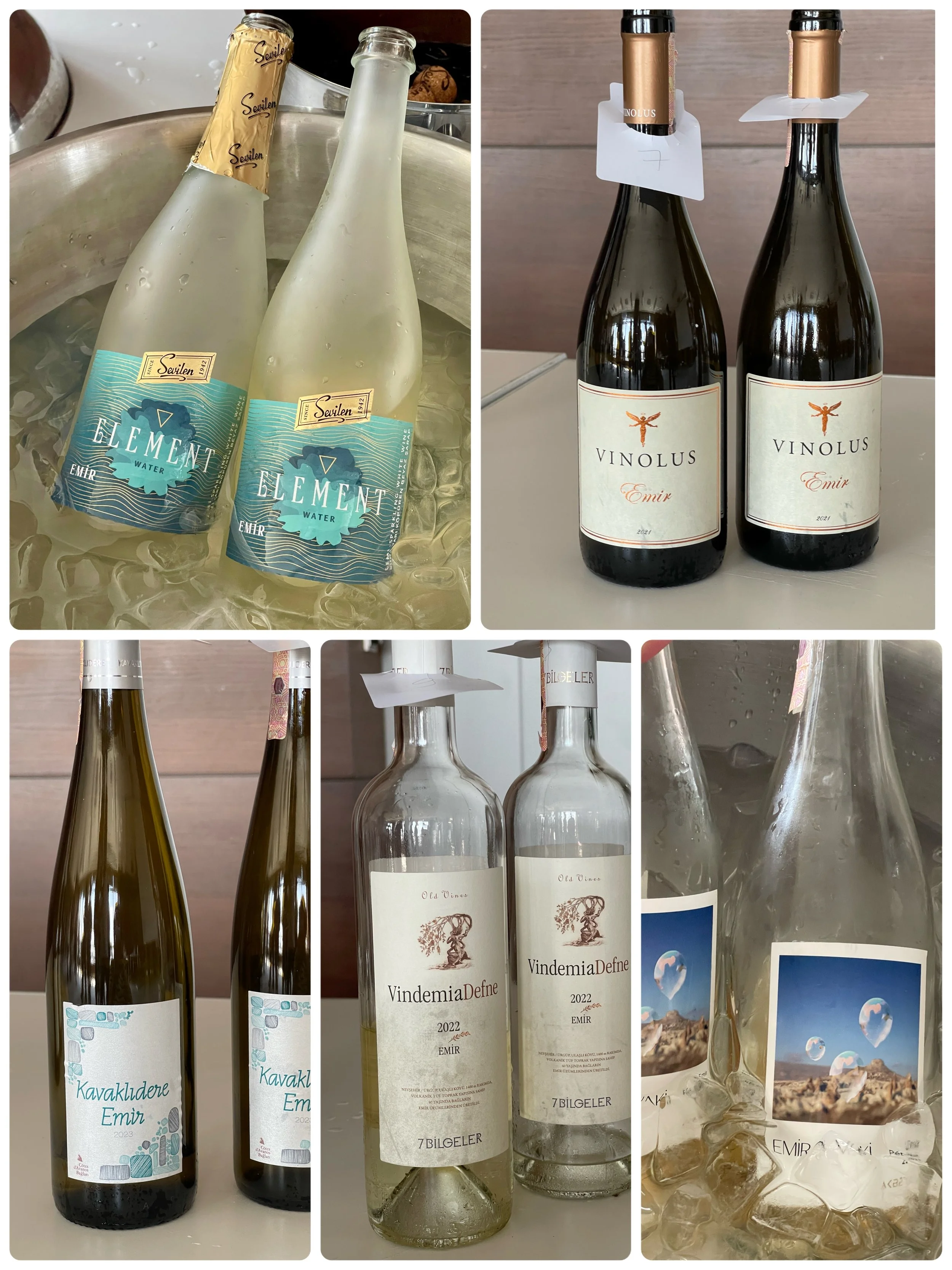 Emir葡萄起源於Cappadocia的Nevşehir,栽種地區大多在Nevşehir和Niğde地區,當地的火山土壤,使得葡萄酒帶礦物質風味,日夜溫度變化大,高海拔地區種植酸度高。 Emir 葡萄酒帶著青蘋果、鳳梨、礦物、檸檬、白玫瑰、奇異果、柑橘等香氣。 色澤較淺,多呈淡黃色泛綠光,帶有熱帶水果與礦物質清香,口感活潑爽脆,酸度高,酒體輕到中等。 以下是會長準備的Emir葡萄酒。