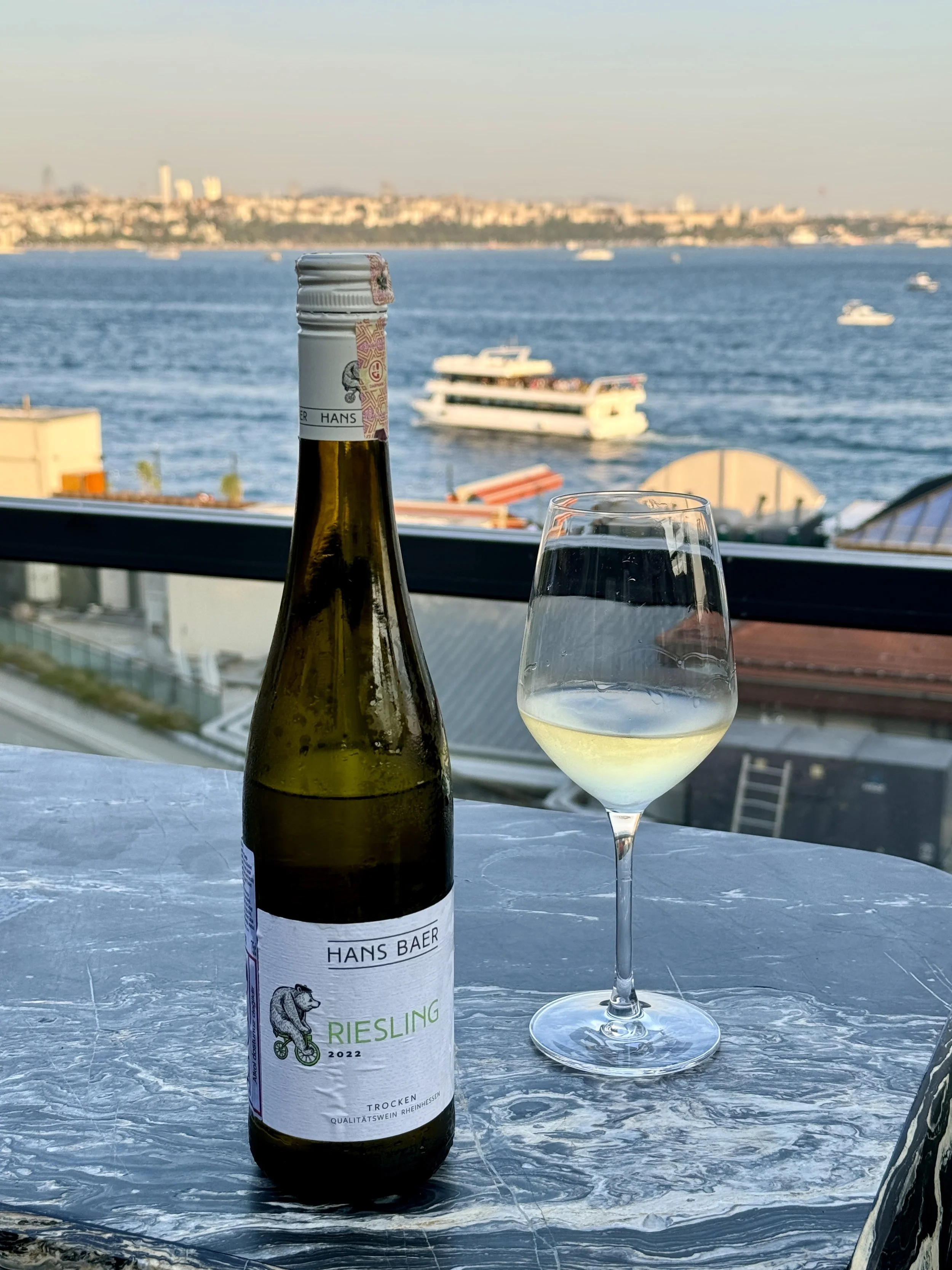 在美麗的博斯普魯斯海峽邊看夕陽,跟好友聽著音樂享受周末的好時光,我擔起點酒大任,仔細研讀酒單,決定放棄心愛的土耳其葡萄酒,因為4-5乘數害我裹足不前。 同時發現德國的白葡萄酒價格合理,乘數大約3左右,肯定性價比高,開瓶後滿意品質與價格。 真心希望有一天餐廳葡萄酒定價合理化,讓消費者歡欣暢飲不傷荷包,生產商能增加銷量靈活經營,相信餐廳受益最高,葡萄酒消費增加能提升餐點水準與銷售,再也不要讓消費者打開酒單受到驚嚇啊!